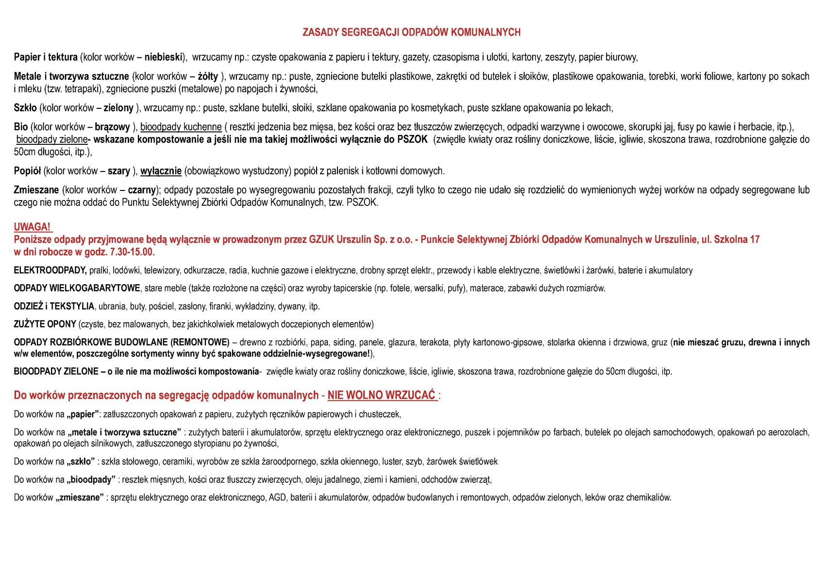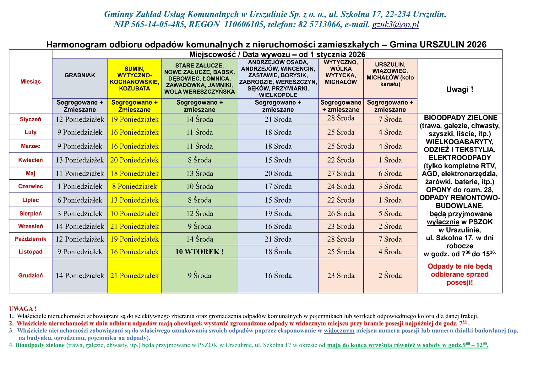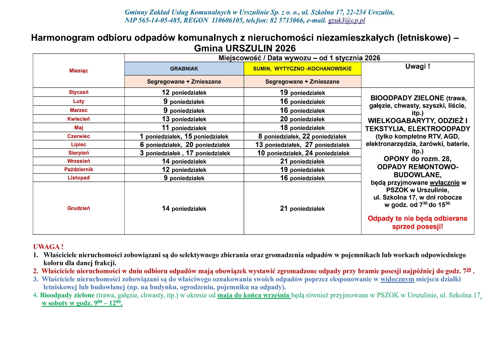 Harmonogram odbioru odpadów